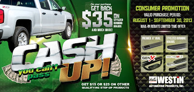 Mail-in a copy of your proof of purchase receipt postmarked by October 30, 2013, for your purchase of a qualifying Westin Step Bar (20/21/21-2/22-5/22-6/23/23-7/24/25/26/27/28-series) made from August 1, 2013 through September 30, 2013, along with the original UPC bar code label cut from the product box (including cardboard), and a completely filled-out mail-in rebate form, to: CASH UP! Offer# WE13-9656, PO Box 472, Scottsdale, AZ 85252-0472. Consumer should make a photocopy of the mail-in offer form, original receipt and original part number bar code label in case of dispute or claim of nonpayment. The end consumer is qualified as one that does not resell the product and installs it on their own personal vehicle. To check rebate status online visit: www.rapid-rebates.com. Inquiries must be made within two months of promotion expiration. One claim per person/household and may not be combined with any other offer. Offer valid in the US and Canada. All rebates paid in US dollars. Please allow 8-10 weeks from receiving the original documentation from the consumer for receipt.